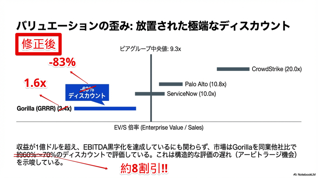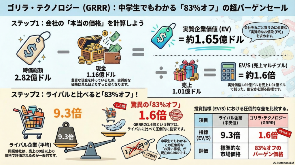 この「本当の値段」を、過去最高となった2025年の売上高(1億140万ドル)で割ると、Gorilla社の実力(EV/S)は「約1.6倍」になります。 同じスマートシティ市場で戦うライバル企業の平均評価が「約9.3倍」であることを考えると、Gorilla社はなんと約8割引きというとんでもないバーゲンセール状態に置かれているのです。