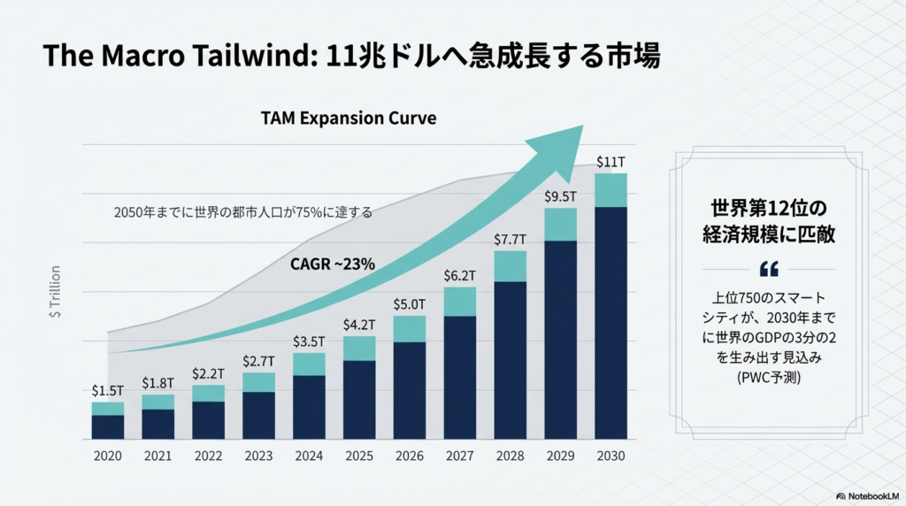 調査会社PWCによると、2030年には世界のトップ750のスマートシティが、世界中の利益(GDP)の3分の2を生み出すようになると予測されています。このまま毎年23%の複利成長が続くとシミュレーションした場合、2030年にはなんと**「約11兆ドル」**という途方もない大きさの市場になります。