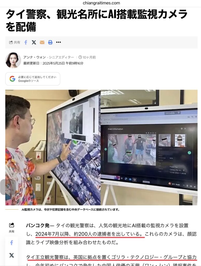 「百聞は一見に如かず。これが実際のタイ観光警察による『IVAR』の稼働実績を報じるニュースです。すでに200人以上の容疑者を特定し、国家の治安維持の中枢にゴリラが組み込まれている証拠です。」