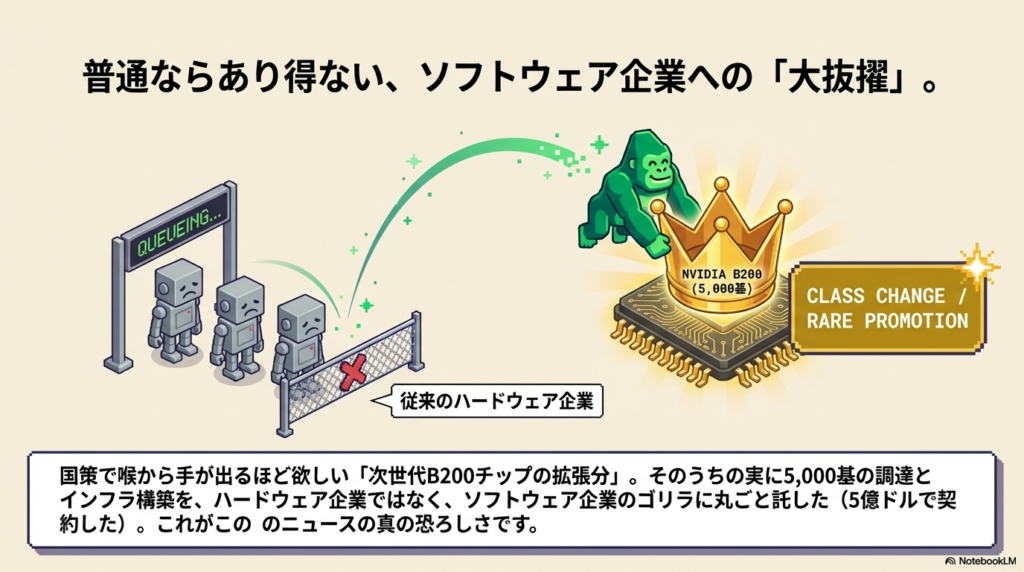 Yottaが国策のために喉から手が出るほど欲しかった「次世代B200の拡張分」。そのうちの実に5,000基の調達とインフラ構築を、**丸ごとゴリラに託した(5億ドルで契約した)**というのが、今回のニュースの本当の意味です。