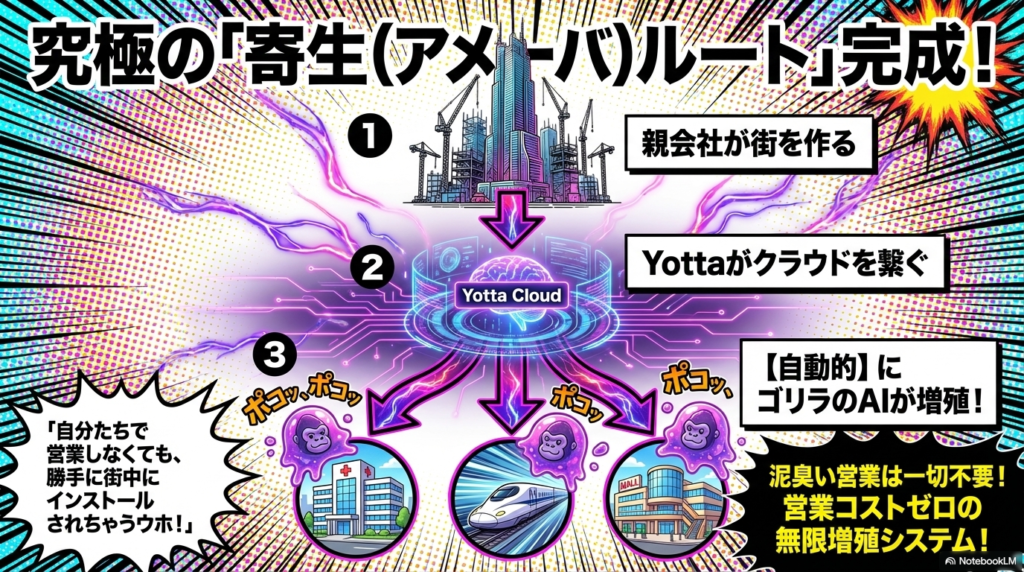 つまり、ゴリラが自分たちで泥臭い営業をしなくても、親会社が街を作るたびに、Yottaのクラウドを通じて、自動的にゴリラのAI(映像解析や量子耐性セキュリティ)が街中にインストールされていく。