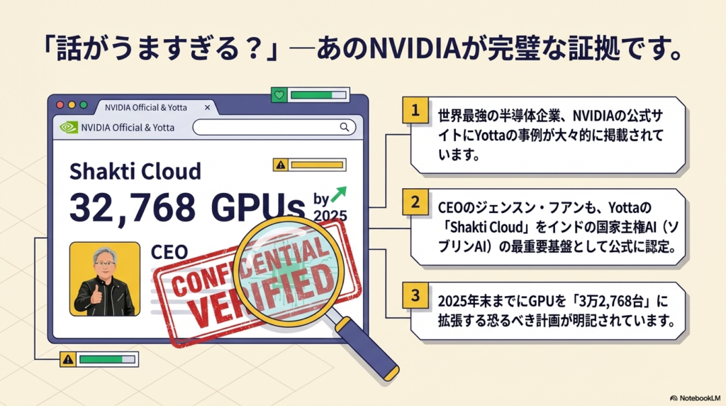 NVIDIAのジェンスン・フアンCEOは、Yottaが構築する「Shakti Cloud(シャクティ・クラウド)」を、インドの国家主権AI(ソブリンAI)の最重要基盤として公式に認めているのです。